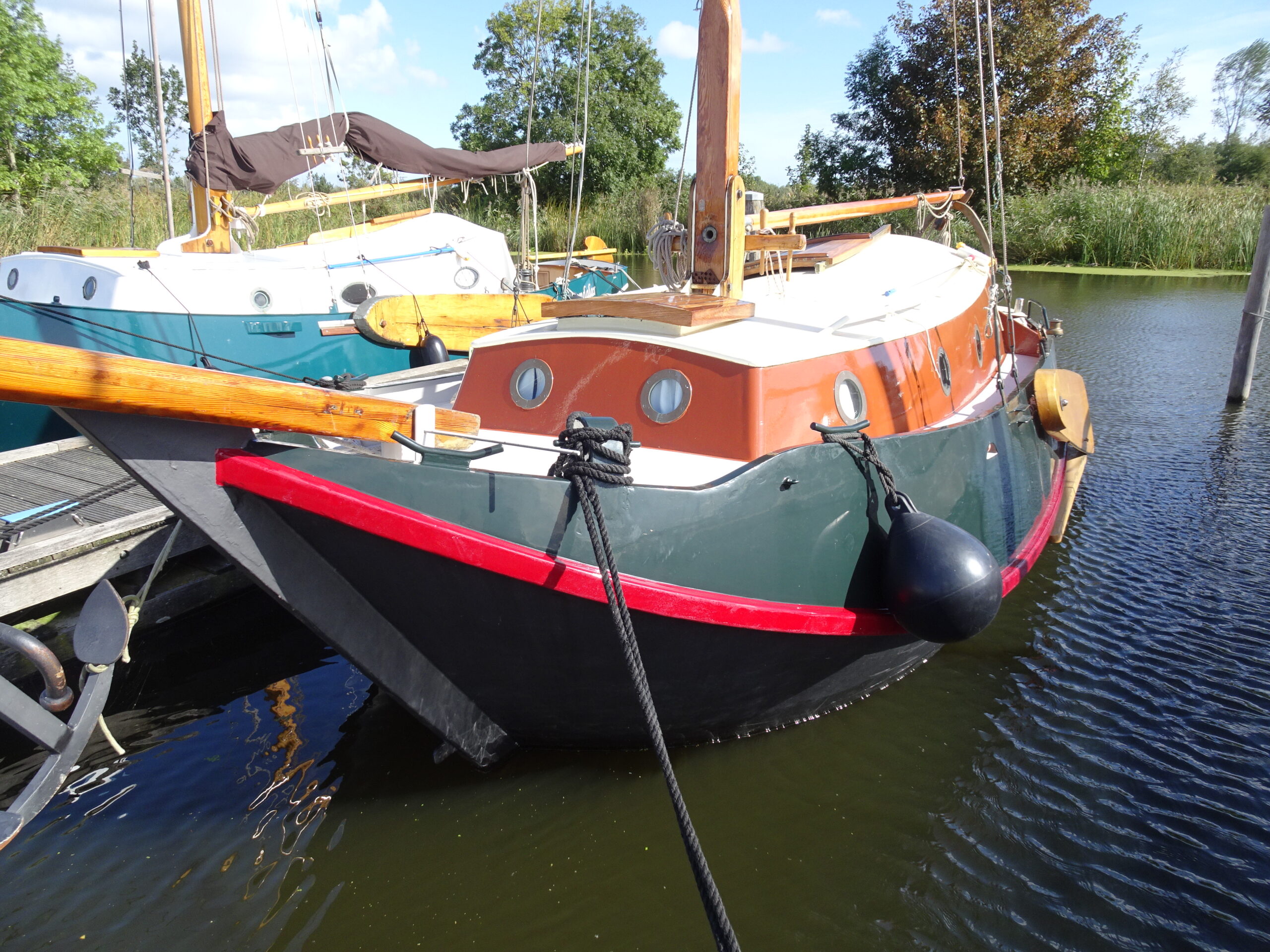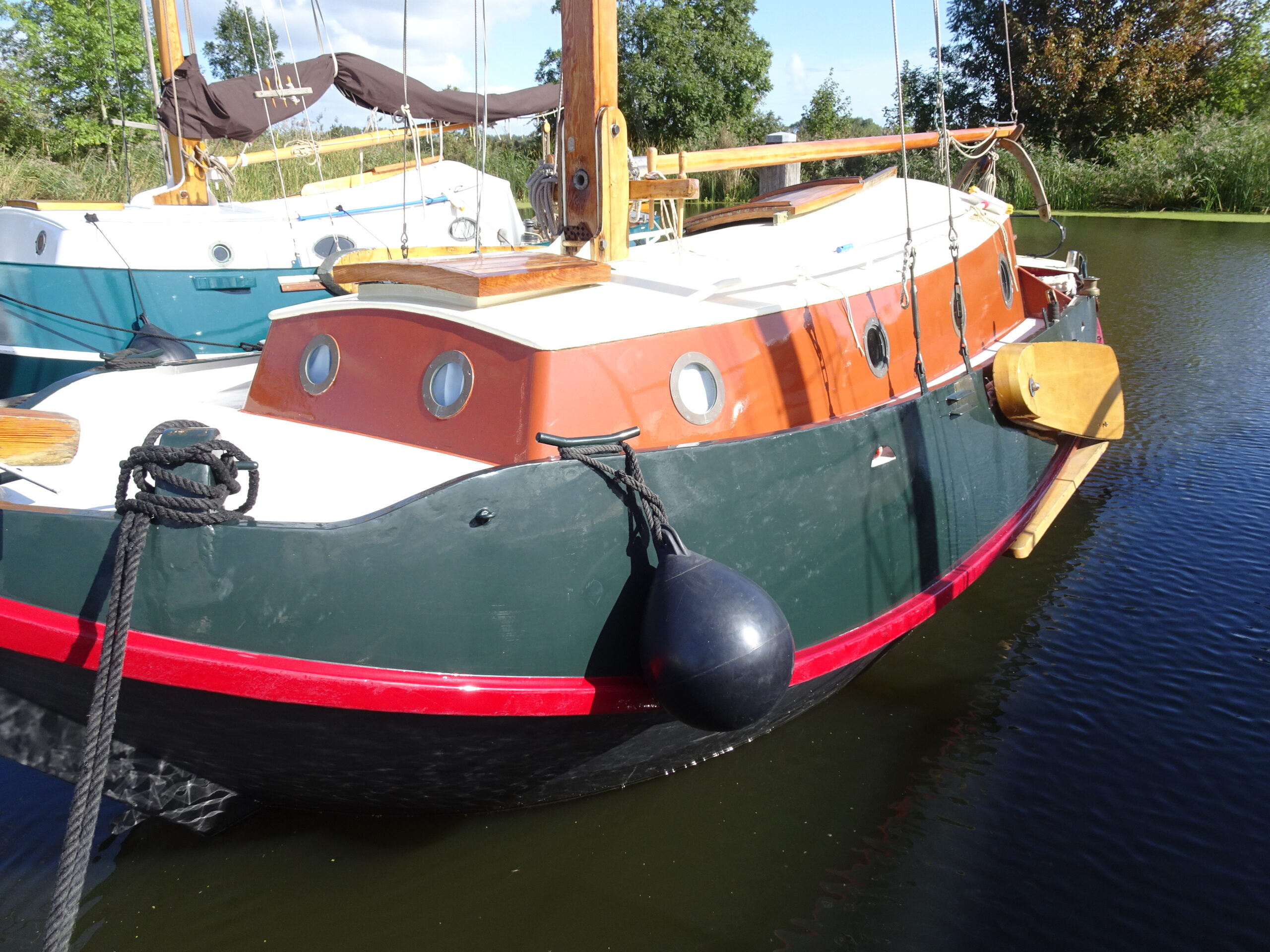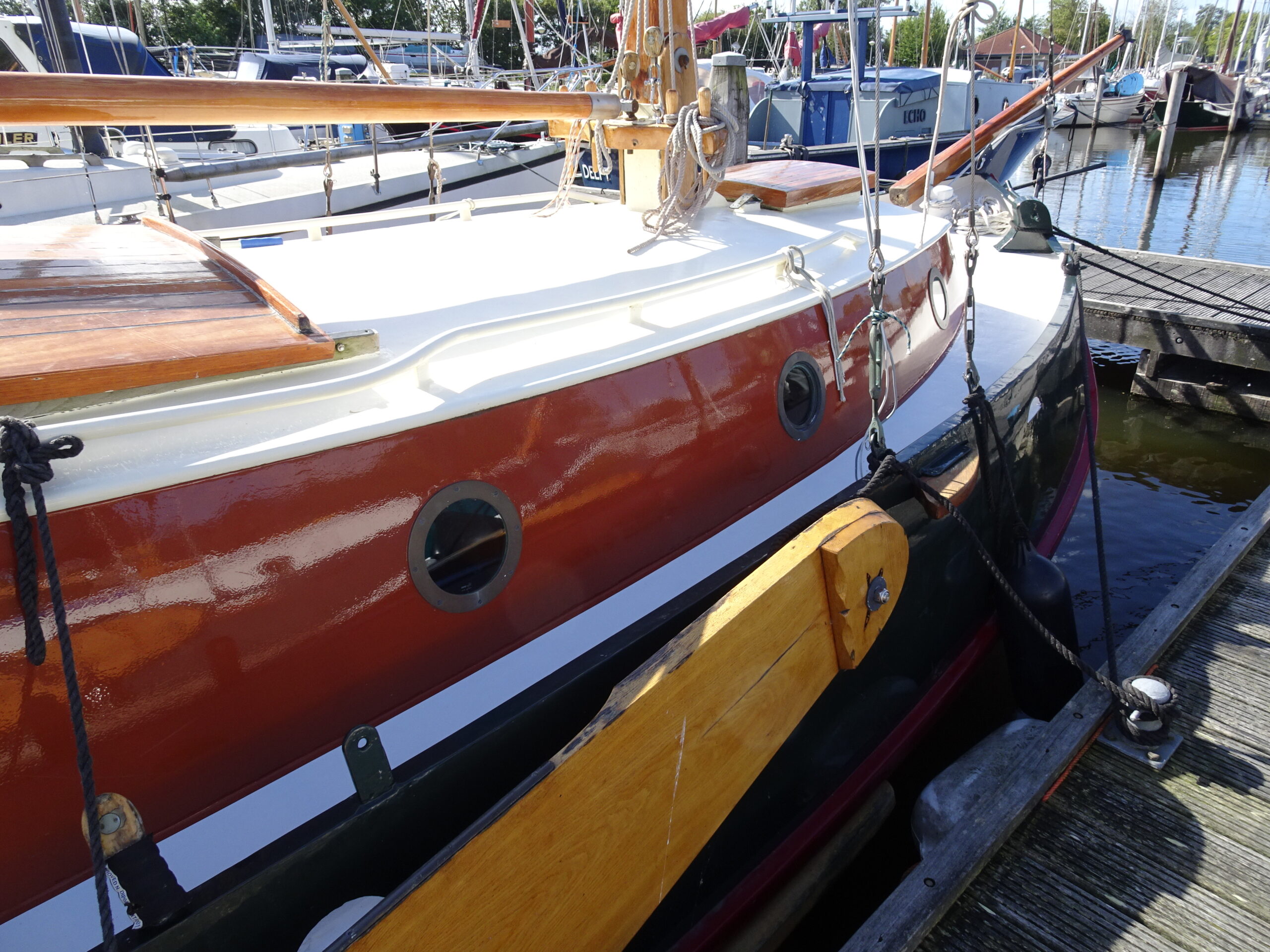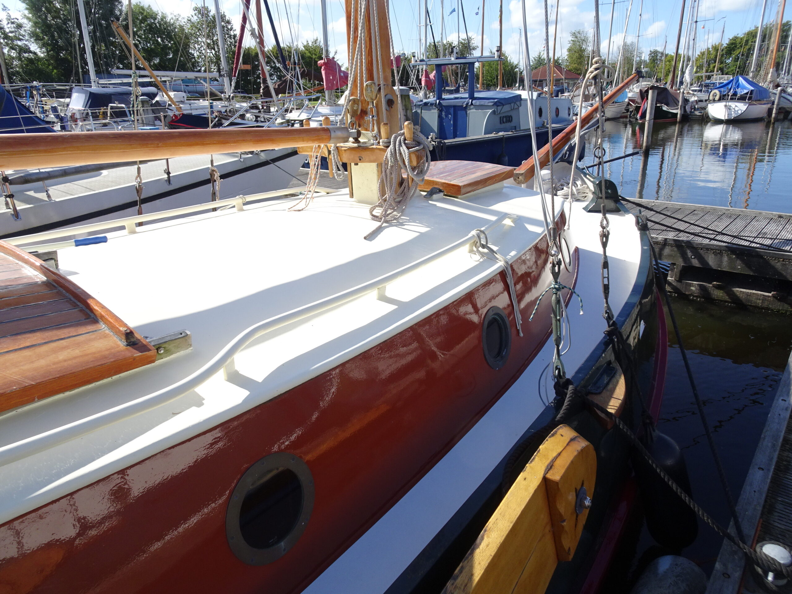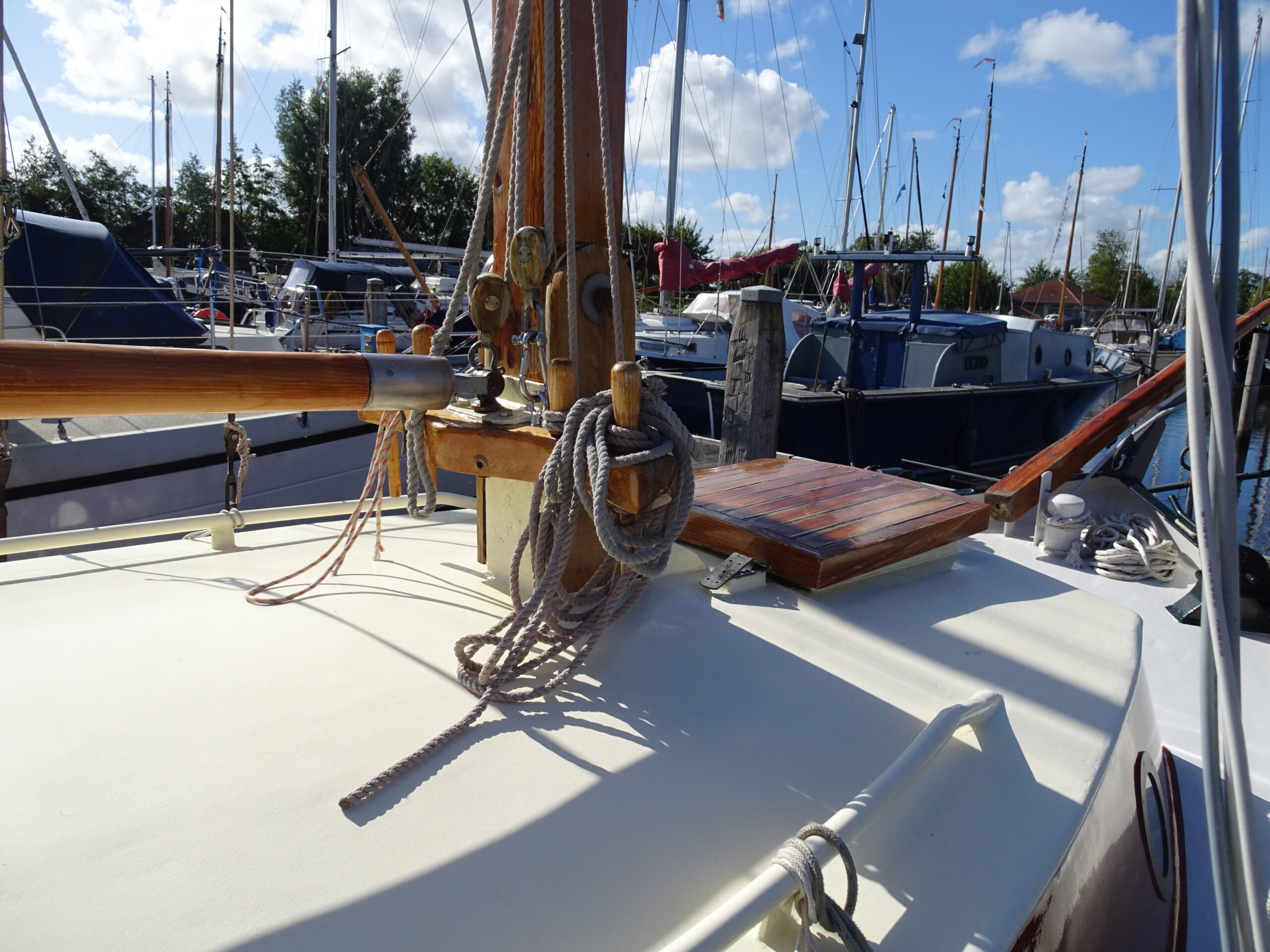 Dan de zeilen, dit is tenslotte een platbodem zeiljacht. De zeilgarderobe bestaat uit een prachtig bruin groot en voorzeil. Beide zeilen zijn in uitstekende staat. Alle schoten, lijnen, vallen, lieren etc. eveneens in zeer goede staat. Er is eeen kluiverboom aanwezig. Voor zowel het grootzeil als het voorzeil (fok) is een zeilhuik aanwezig. De mast, boegspriet, giek, gaffel en zwaarden zijn in goede staat, net als de rest van het schip overigens. De mast heeft recent groot onderhoud gehad: al het beslag is vernieuwd, het houtwerk bij de hommer is aangepakt (alle ringen in de mast zijn gestraald, gepoedercoat en daarna in de 2 componentenverf gezet. Alles in topstaat.