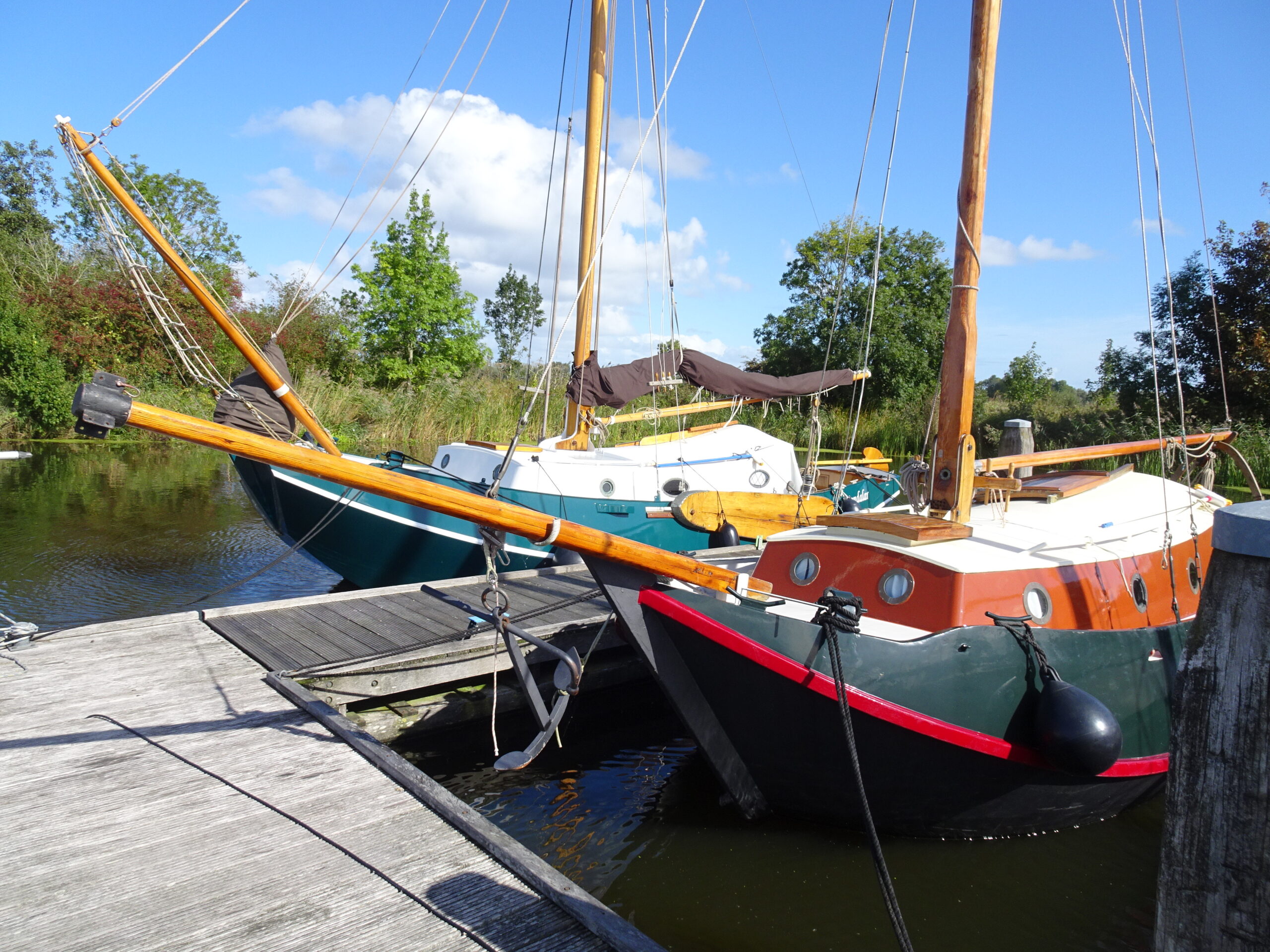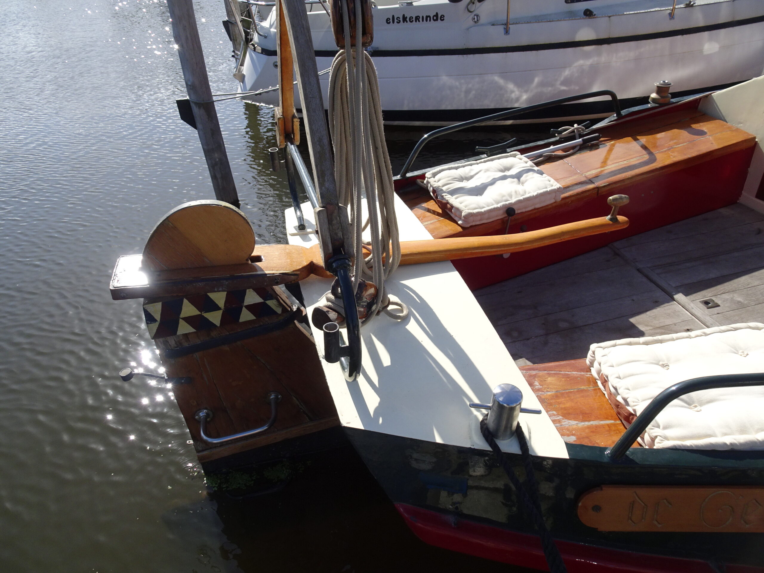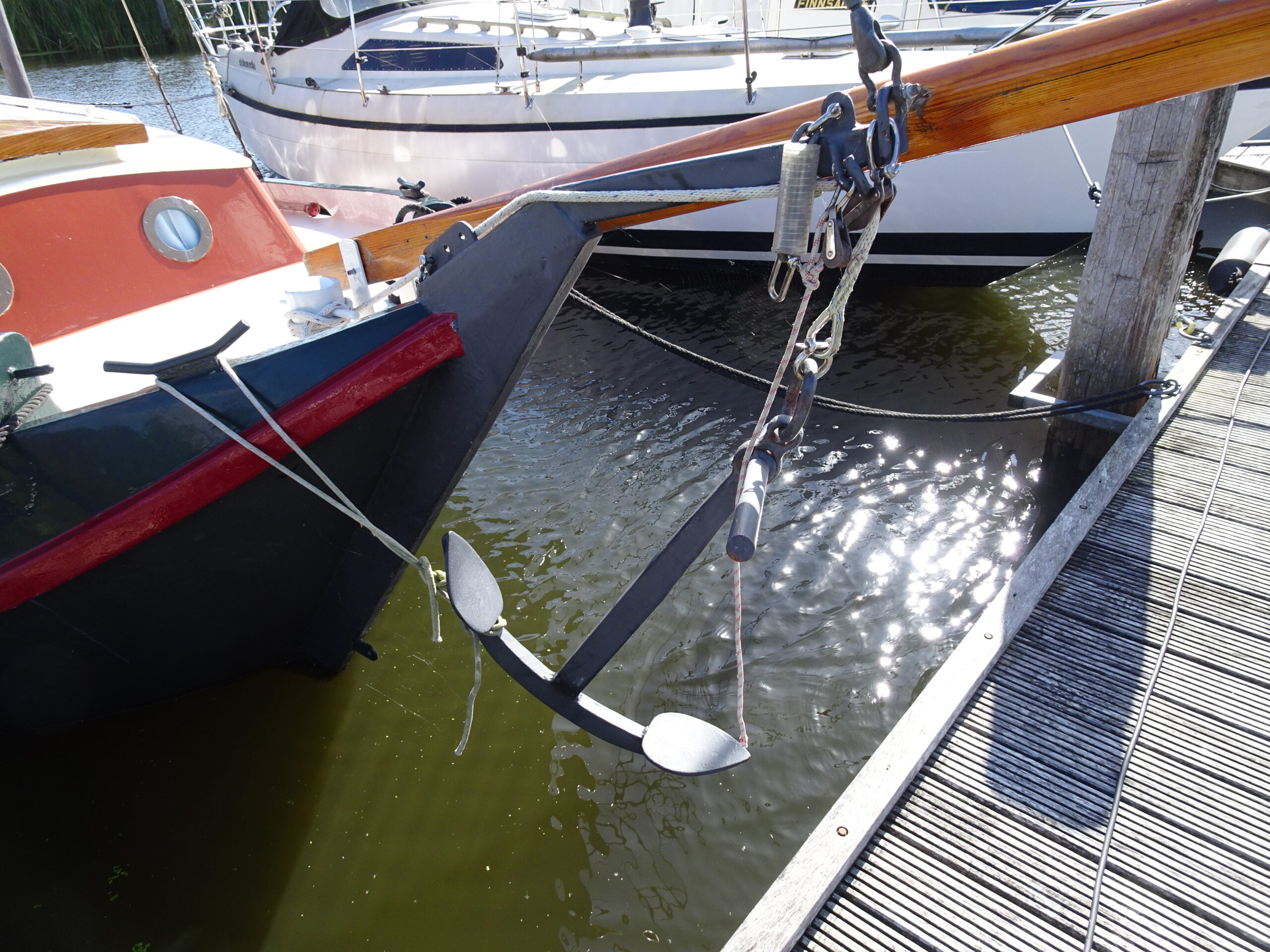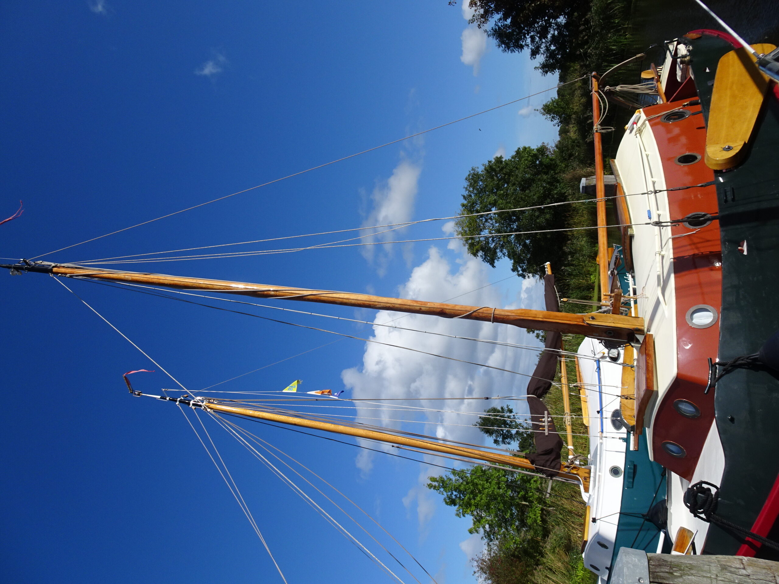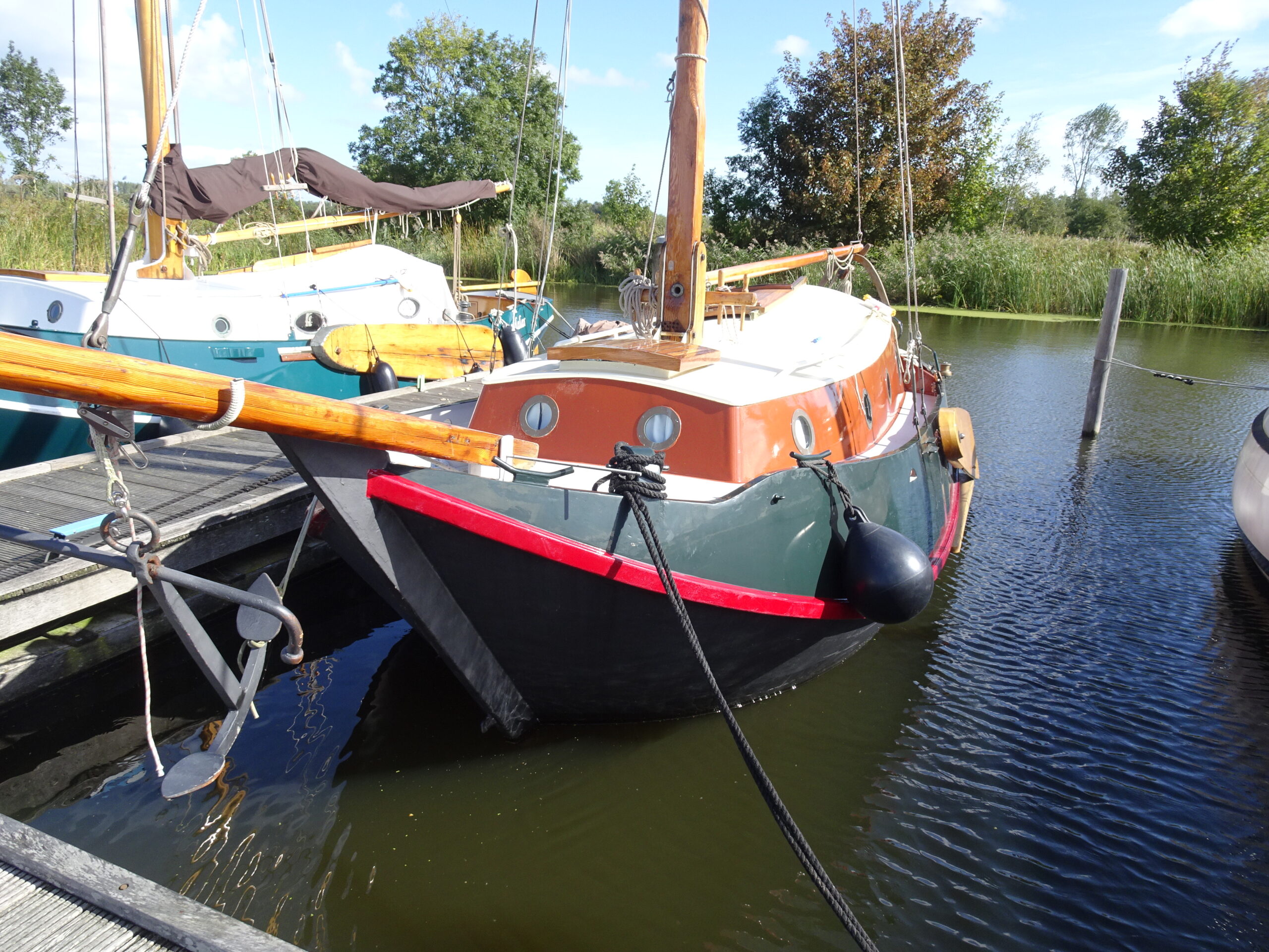 Dan de zeilen, dit is tenslotte een platbodem zeiljacht. De zeilgarderobe bestaat uit een prachtig bruin groot en voorzeil. Beide zeilen zijn in uitstekende staat. Alle schoten, lijnen, vallen, lieren etc. eveneens in zeer goede staat. Er is eeen kluiverboom aanwezig. Voor zowel het grootzeil als het voorzeil (fok) is een zeilhuik aanwezig. De mast, boegspriet, giek, gaffel en zwaarden zijn in goede staat, net als de rest van het schip overigens. De mast heeft recent groot onderhoud gehad: al het beslag is vernieuwd, het houtwerk bij de hommer is aangepakt (alle ringen in de mast zijn gestraald, gepoedercoat en daarna in de 2 componentenverf gezet. Alles in topstaat.