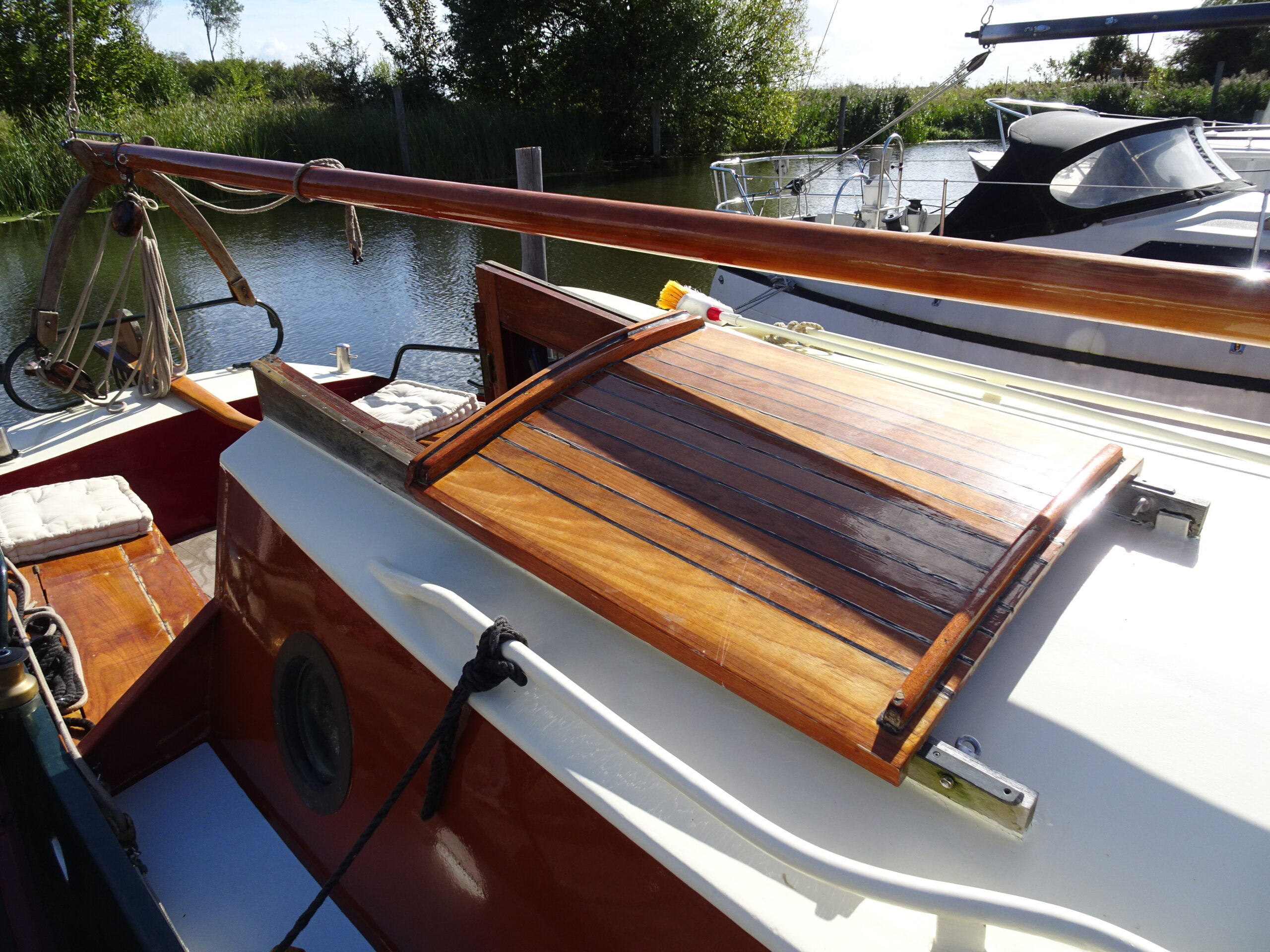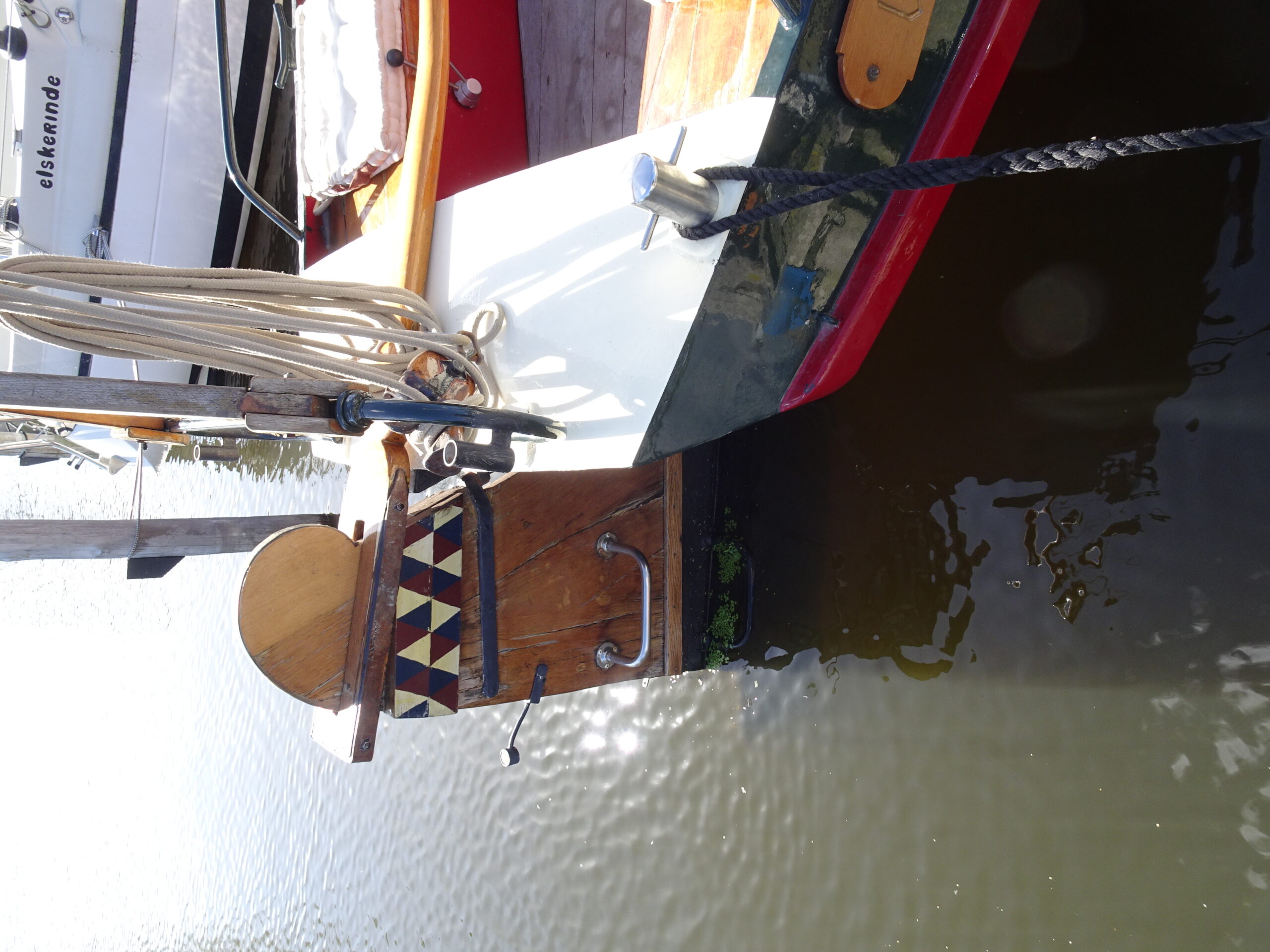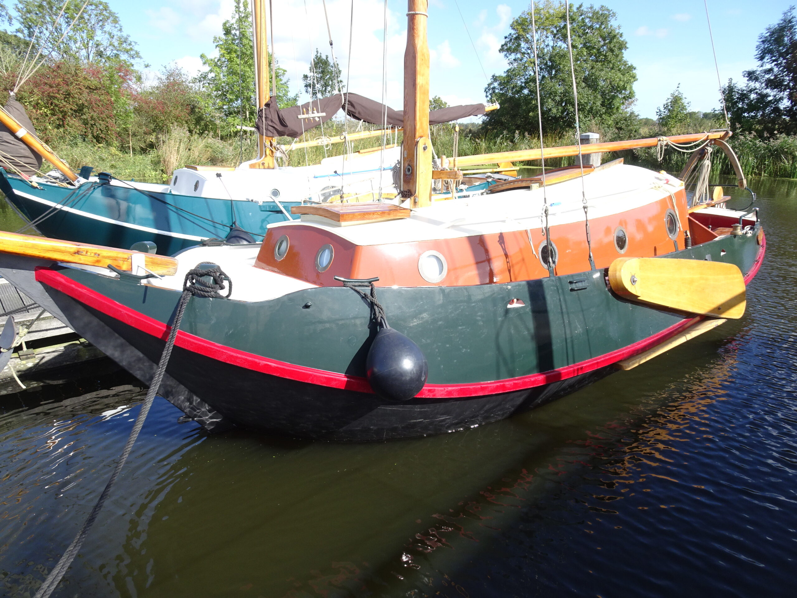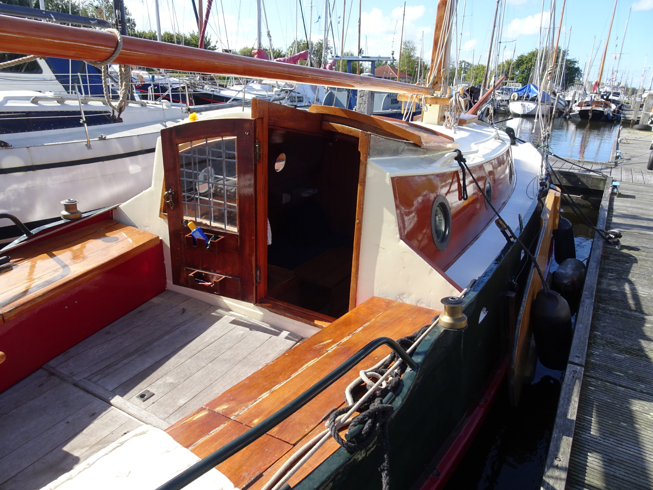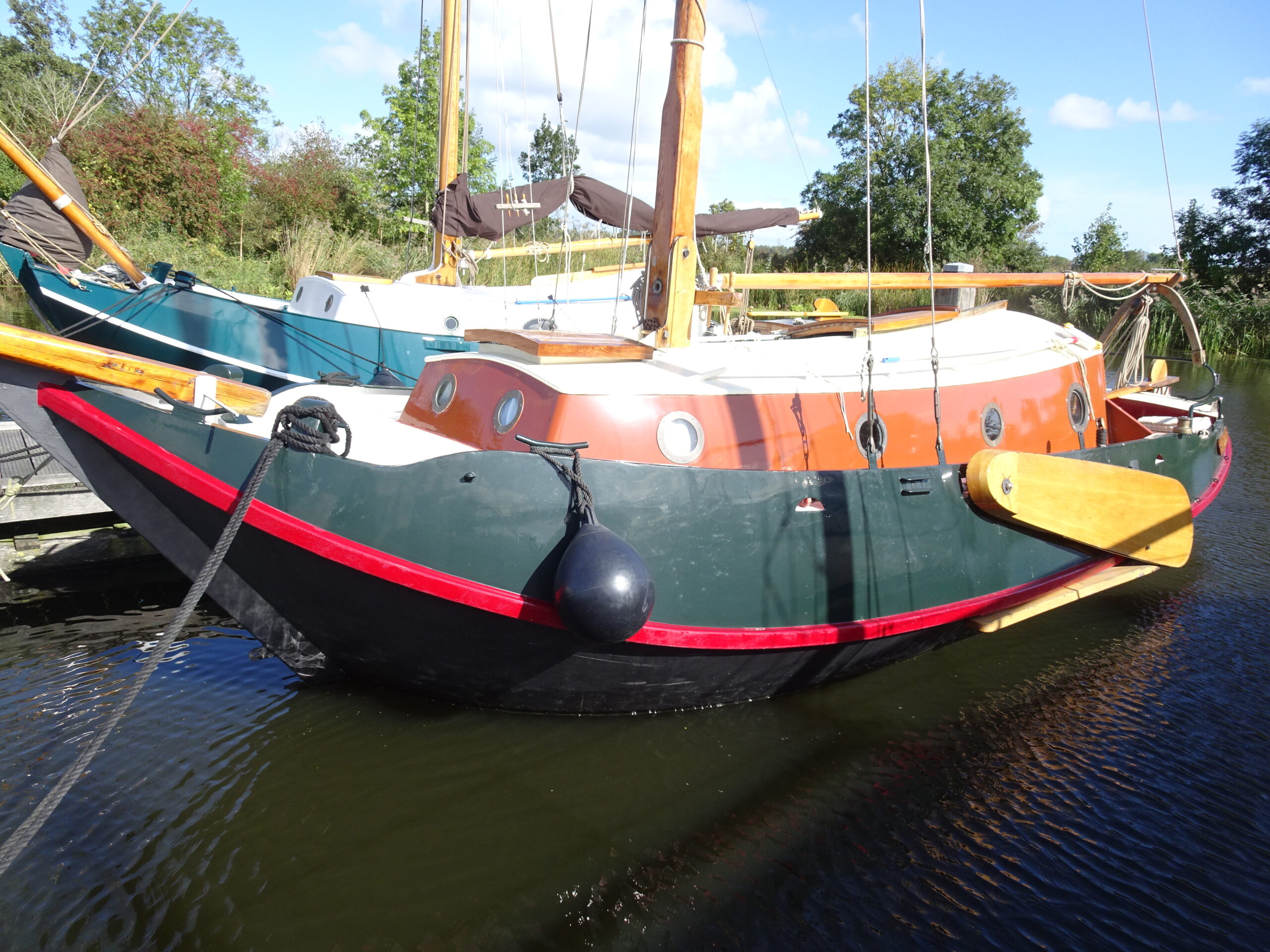 Dan de zeilen, dit is tenslotte een platbodem zeiljacht. De zeilgarderobe bestaat uit een prachtig bruin groot en voorzeil. Beide zeilen zijn in uitstekende staat. Alle schoten, lijnen, vallen, lieren etc. eveneens in zeer goede staat. Er is eeen kluiverboom aanwezig. Voor zowel het grootzeil als het voorzeil (fok) is een zeilhuik aanwezig. De mast, boegspriet, giek, gaffel en zwaarden zijn in goede staat, net als de rest van het schip overigens. De mast heeft recent groot onderhoud gehad: al het beslag is vernieuwd, het houtwerk bij de hommer is aangepakt (alle ringen in de mast zijn gestraald, gepoedercoat en daarna in de 2 componentenverf gezet. Alles in topstaat.