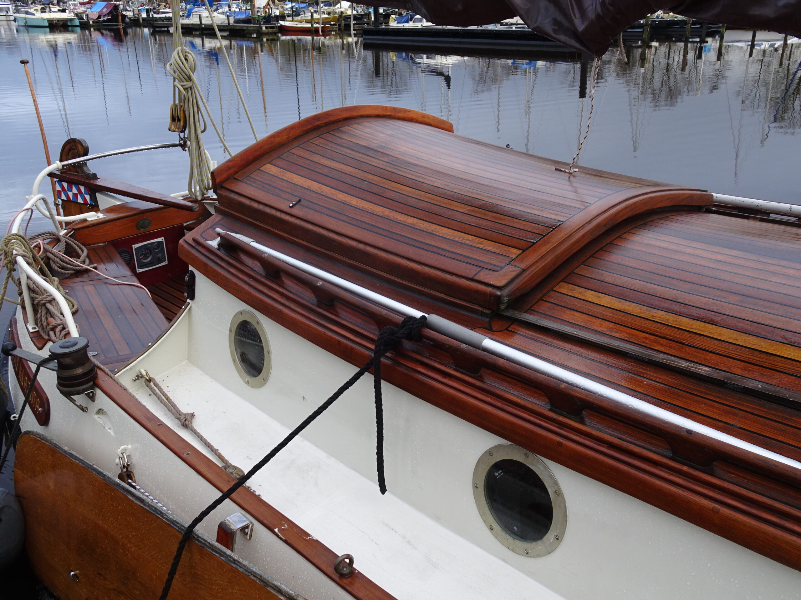 Na het bekijken van de foto’s van deze Kooijman & de Vries Vollenhovense Bol 8,10 kunnen we concluderen dat het schip in een meer dan goede staat verkeert. Ze is zomer 2025 helemaal kaal gehaald en in 2 lagen Epoxy primer gezet, vervolgens is ze in 2 componenten jachtlak gespoten, alles door een Jachtwerf. Onderwaterschip, romp, dek en opbouw zijn allen professioneel behandeld en kunnen er weer jaren tegen. De rondhouten en zwaarden zijn eveneens kaal gehaald en opnieuw professioneel gelakt. Het schip oogt als nieuw. Wat het afmaakt is het fraaie teakdek op het dak van dit platbodem zeiljacht, dat is in topstaat (is in 2012 nieuw geplaatst). Verder is tijdens de refit zomer deze zomer de elektra aan boord vernieuwd, inclusief 2 nieuw leefaccu’s.