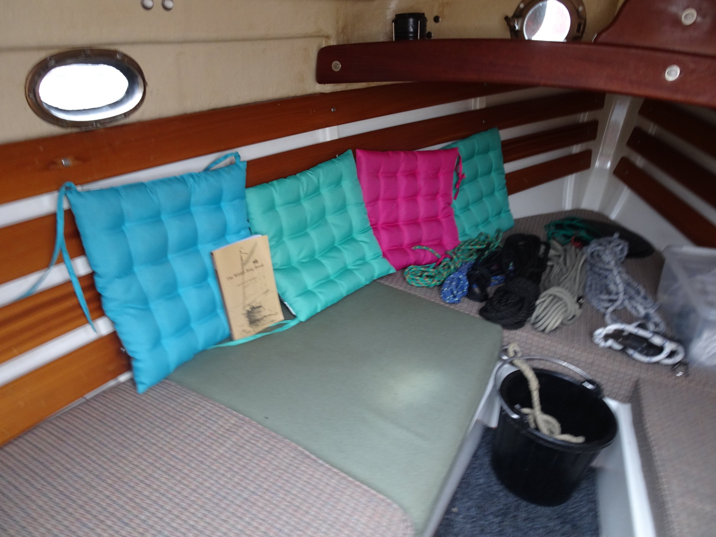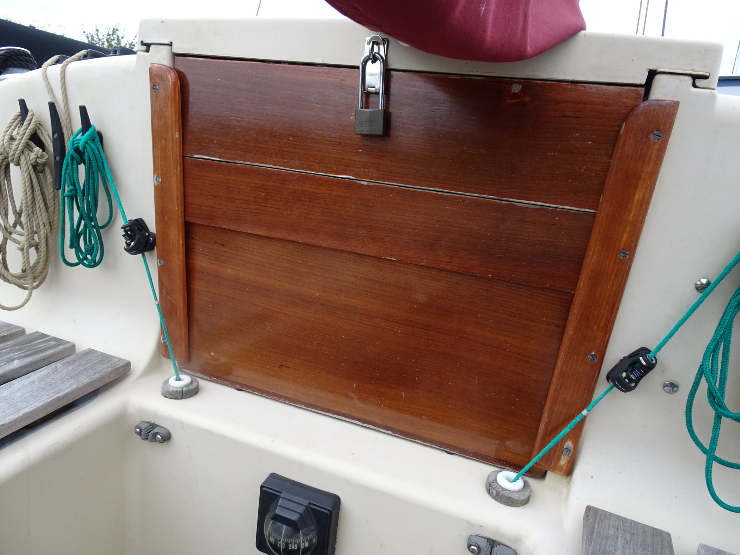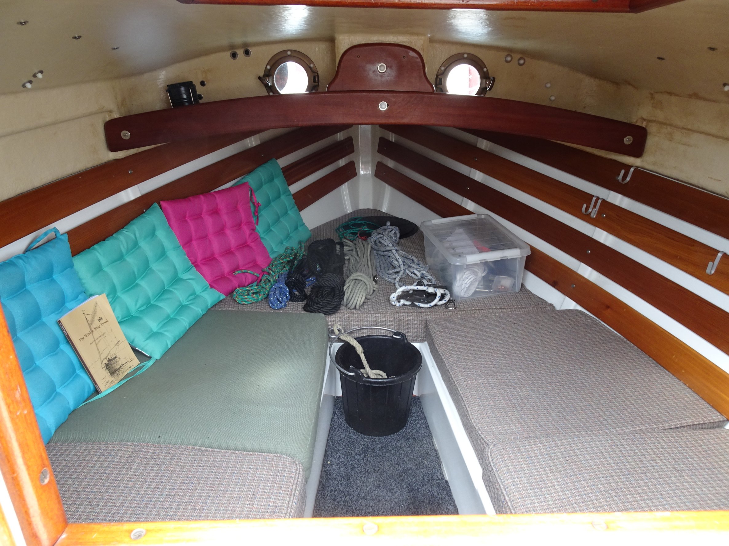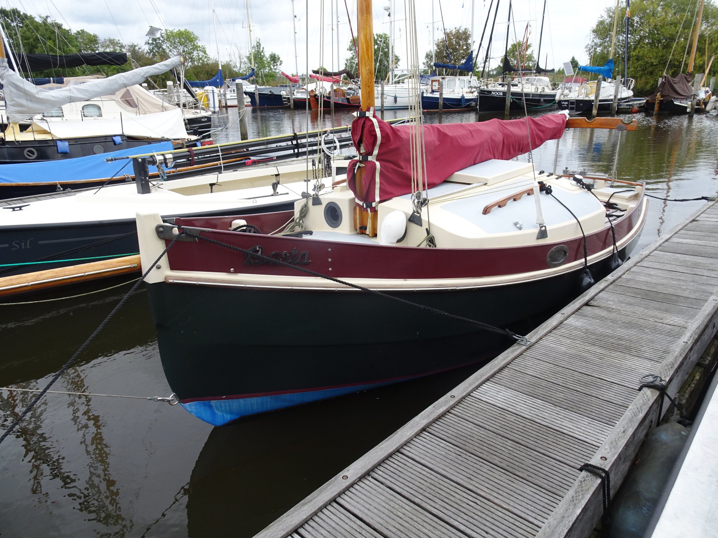 Ondiepe binnenwateren zijn geen probleem door de 2 ophaalbare zwaardjes (die beide overigens vernieuwd zijn), en ook de Waddenzee is een prachtig vaargebied voor deze bootjes. Easy overal heen te brengen met de trailer, mast ligt zo plat en staat overigens ook in no time. Van binnen ruimte voor 2 volwassenen, zit een klein keukentje in, chemisch toilet erbij, niet de meest luxe boot maar toch, qua sfeer en gezelligheid alsmede gebruikersplezier simpelweg nauwelijks te evenaren. De boot is 16ft. lang en weegt 600 kilo, incl. trailer onder de 1.000KG totaal, kan dus achter behoorlijk wat auto’s vervoerd worden. Er zit een 6PK Yamaha buitenboordmotor bij, 2 takt, loopt geweldigen weegt niet teveel. Ja…… wat een leuk ding. In goede staat, kan zo mee voor al jouw vaaravonturen op Wad en binnenwater.